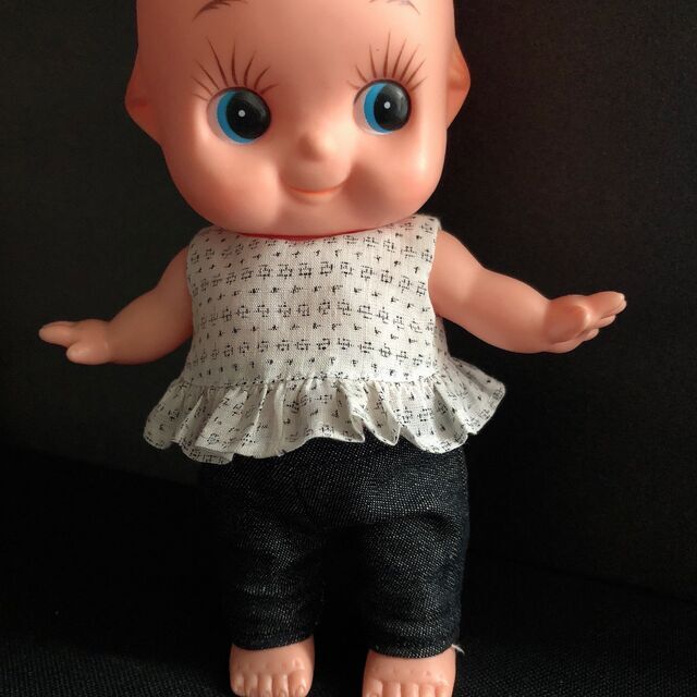 白絣で浴衣を製作した残りの布でノースリーブのブラウスを作りました。暑くなると涼やかな見た目も重要です。シンプル過ぎるので裾にフリルを付けました。モデルのキューピーは、どのような服でも着こなせます。パンツと合わせるとよりかわいいです(自画自賛してます)。