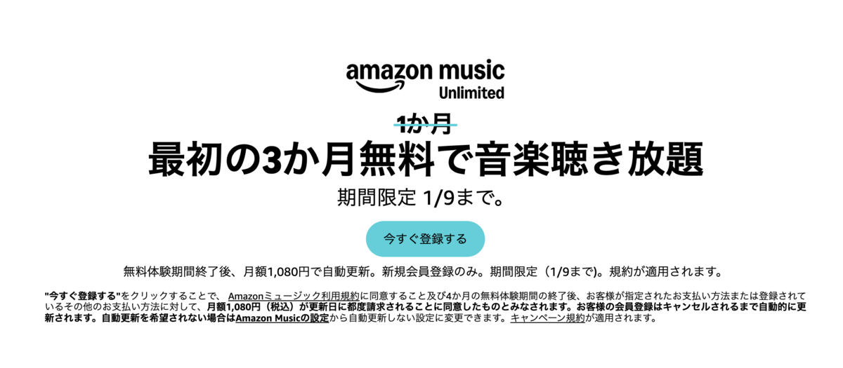 - Amazon Music Unlimitedが最大3か月無料【1/9まで】