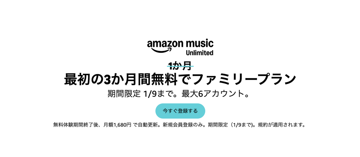 - Amazon Music Unlimitedファミリープランも最大3か月無料【1/9まで】