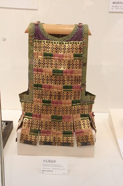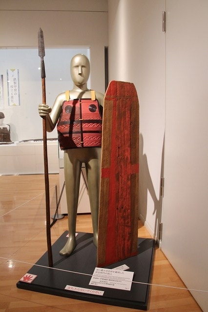 古代から戦国時代に至るまでの甲冑の歴史を展示。最初は木で作られていた甲冑が、鉄片を連ねたもの(いわゆる挂甲というやつ)になり、さらには中世を経て戦国期の甲冑に至る歴史が発掘品などと共に展示されている。