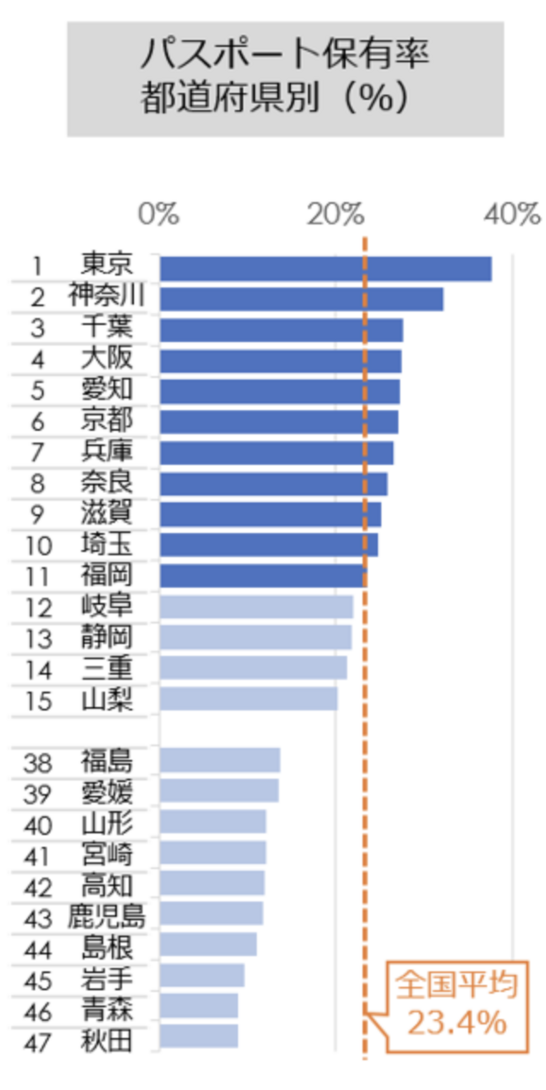 パスポート保有率が高い都道府県のトップは東京都で約3割の人がパスポートを持っている。2位は神奈川県で23.6%、3位は大阪府で20.4%。保有率が低い3県、47位秋田県、46位青森県、45位岩手県の東北です。