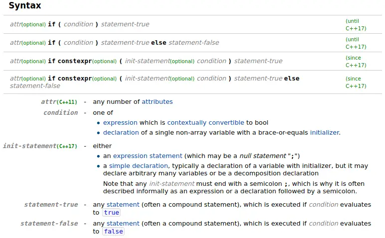 }Why is there a variable definition inside the condition of the if-statement? Let’s use cppreference to figure out what it does by searching for “cppreference if statement” in our favorite search engine. Doing so leads us to if statements. At the top, there’s a syntax reference.