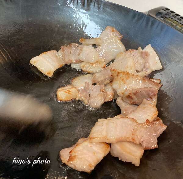 - 中華鍋で、下茹でをした豚肉スライスをこんがり焼きます