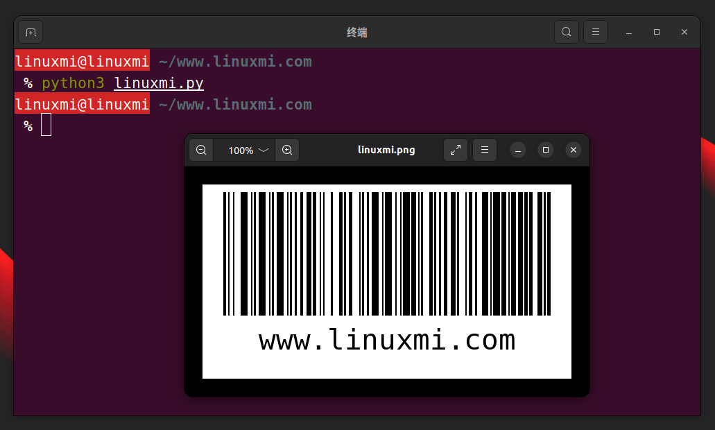 generate_barcode函数根据给定的数据和格式(barcode_format)生成条形码,并将条形码图像保存到文件linuxmi.png中。文件扩展名取决于您使用的写入器类别。
