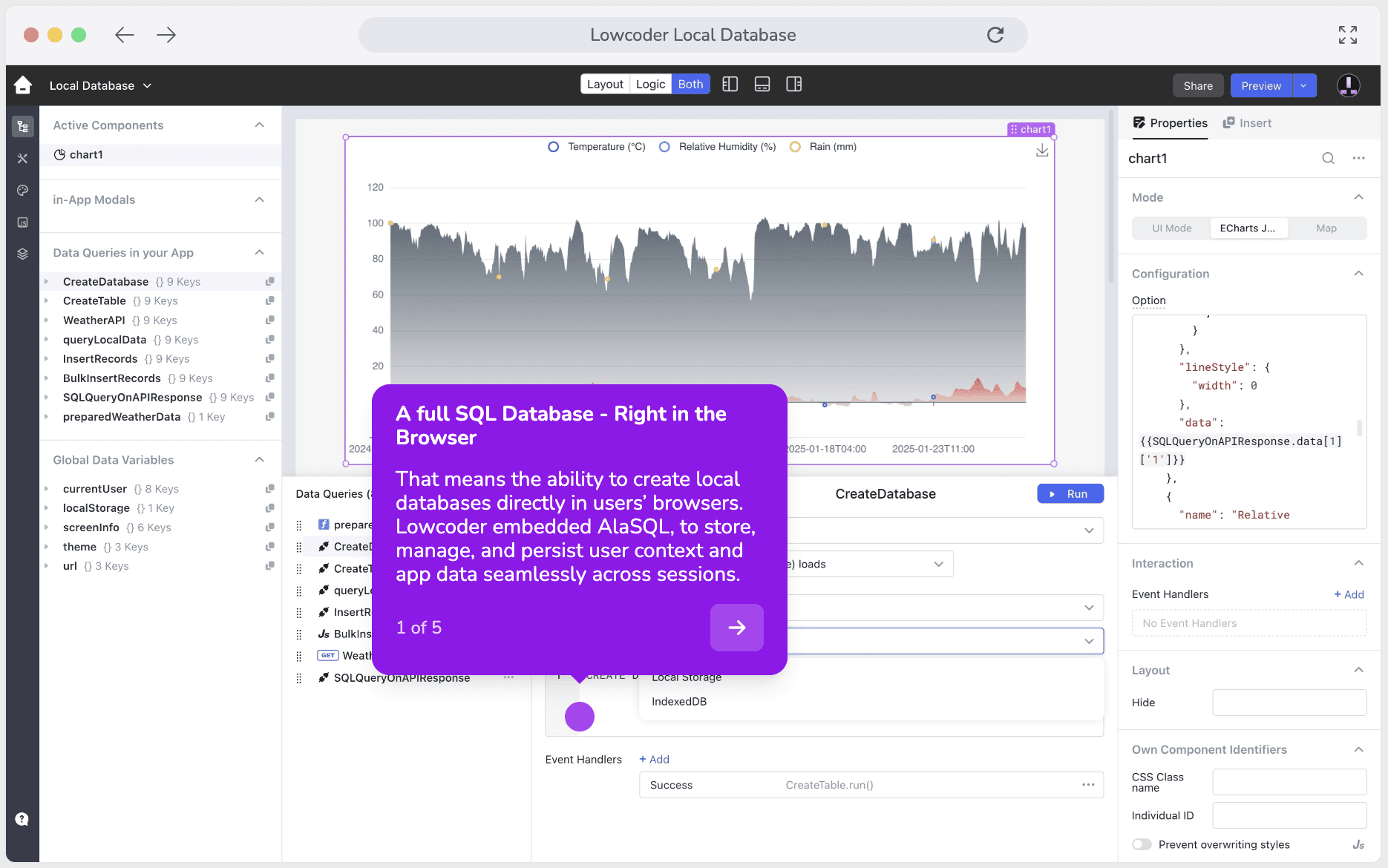 Lowcoder’s browser-local database capabilities deliver flexibility, speed, and partial offline functionality. It gives you full SQL query capabilities, including support for hierarchical JSON structures. Perform fast, client-side grouping, sorting, caching, and paging for local Databases and even API Call Responses.