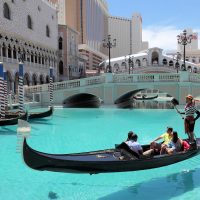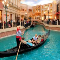 カジノ(1階)の上のフロアに広がるショッピングモール「グランドキャナルショップス」(2階)と、ベネチアンの前庭の広場には、本場ベニスの街を模倣した水路があり、そこではゴンドラライド(有料)を楽しめるようになっている。(写真下、これは屋内)