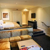 ただ、スイートルームとはいっても、リビングルームとベッドルームが完全にセパレートになっている正式なスイート形式ではなく、広めのひと続きの部屋のフロアに段差を設けてリビングルームとベッドルームを視覚的に分けて見せるいわゆるミニスイート(もしくはジュニアスイート)と呼ばれる部屋であることは頭に入れておく必要がある。(写真下。床に2段の段差が見える)