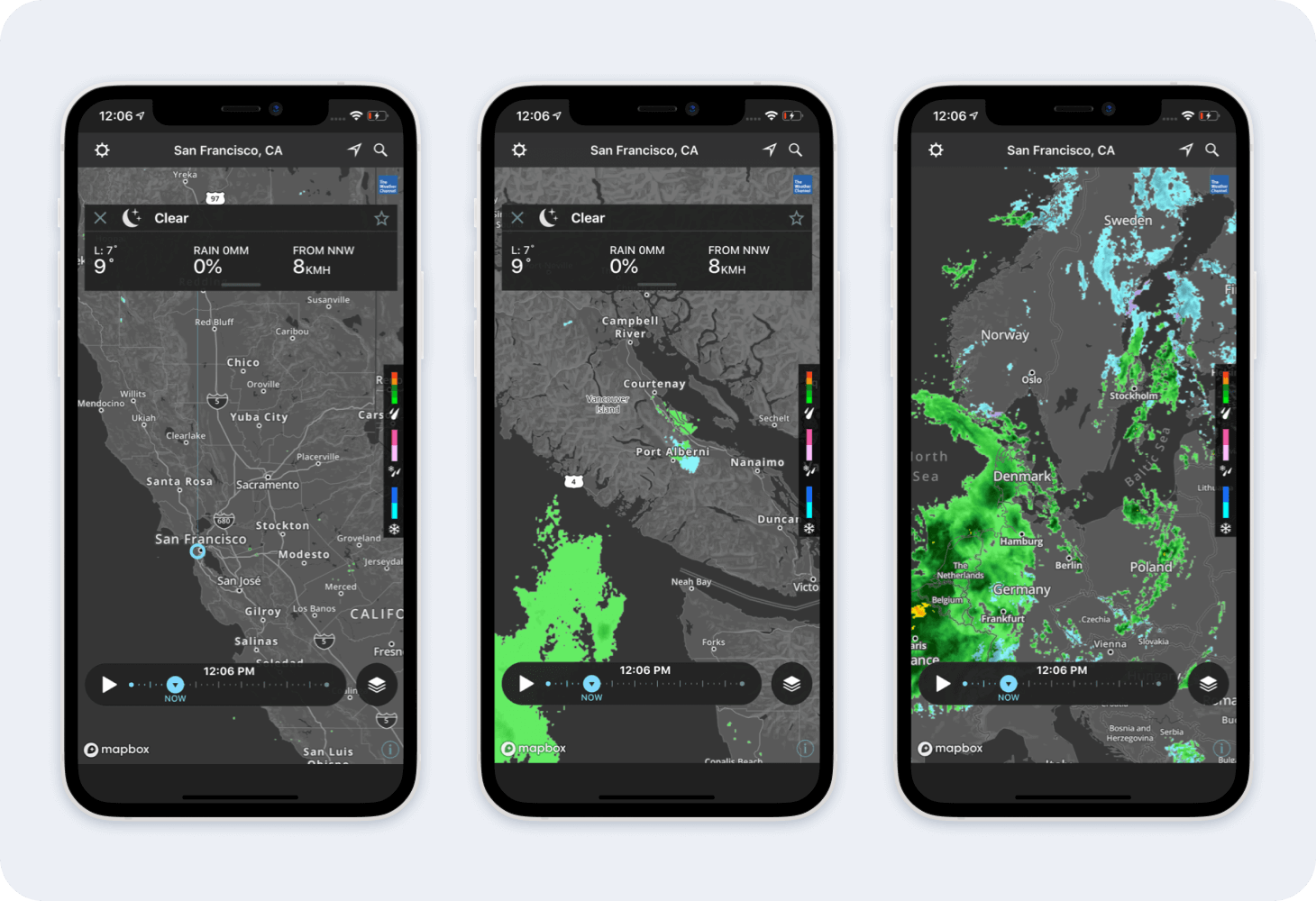 Build data driven interactive weather visualizations layered on Mapbox base maps for radar, satellite data, temperature and more. Allow stepping through time to view forecast data, and turn various data layers on and off.