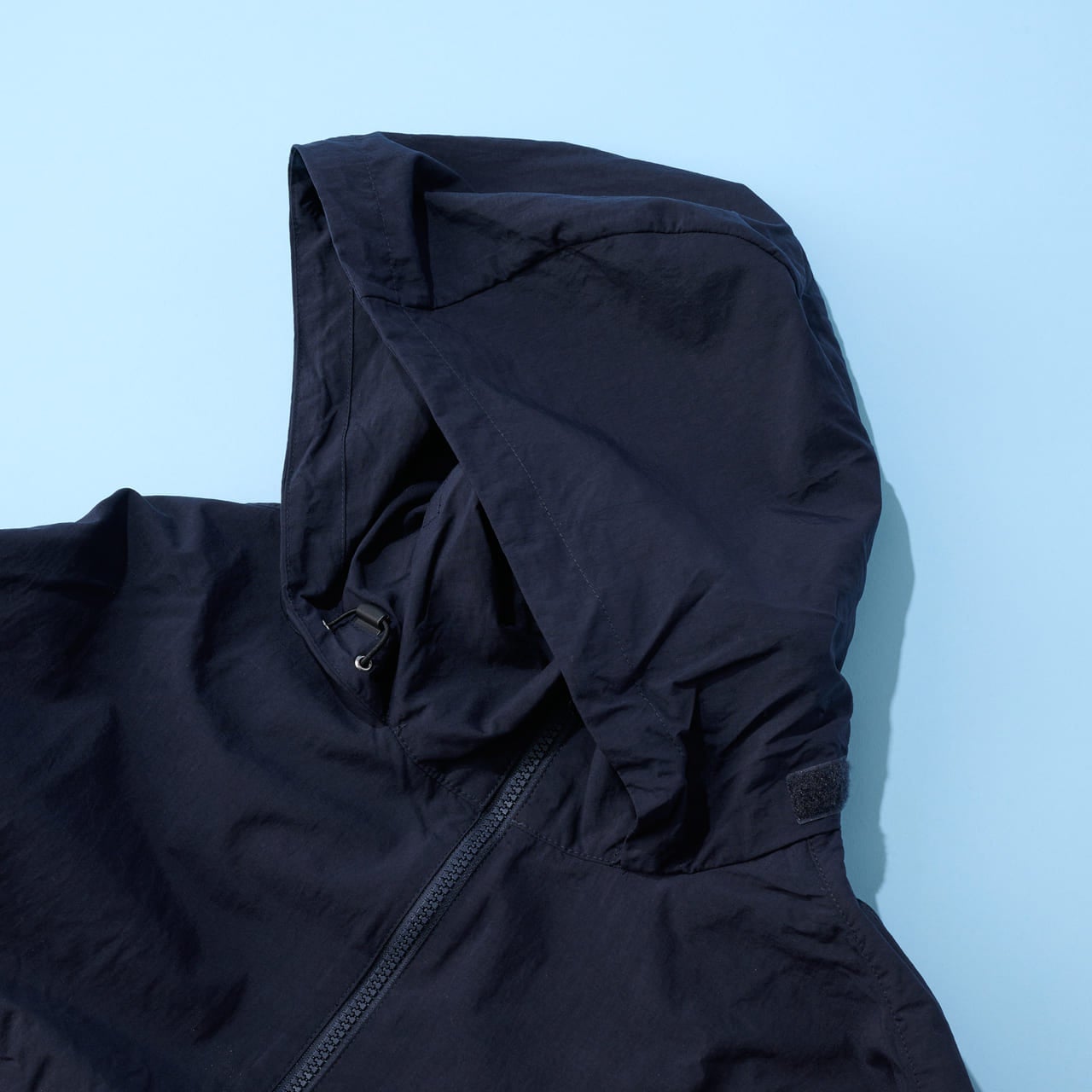 ダブルの比翼仕立てで風をシャットダウンしてくれたり、フード部分にツバがついていたり、と機能性も抜群。