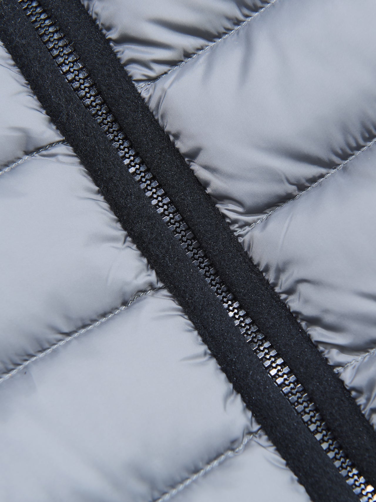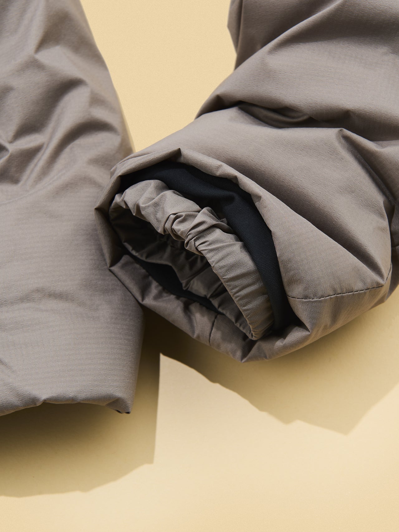 ステッチレスの三層仕様になっており、すっきりとした印象に。インナーダウンとしての機能は保ちつつ、アウターとしても着映えするデザインになっている。ポケッタブル仕様になっているので持ち運びも可能。表地には撥水加工を施しており、小雨程度の水なら弾くことができる。