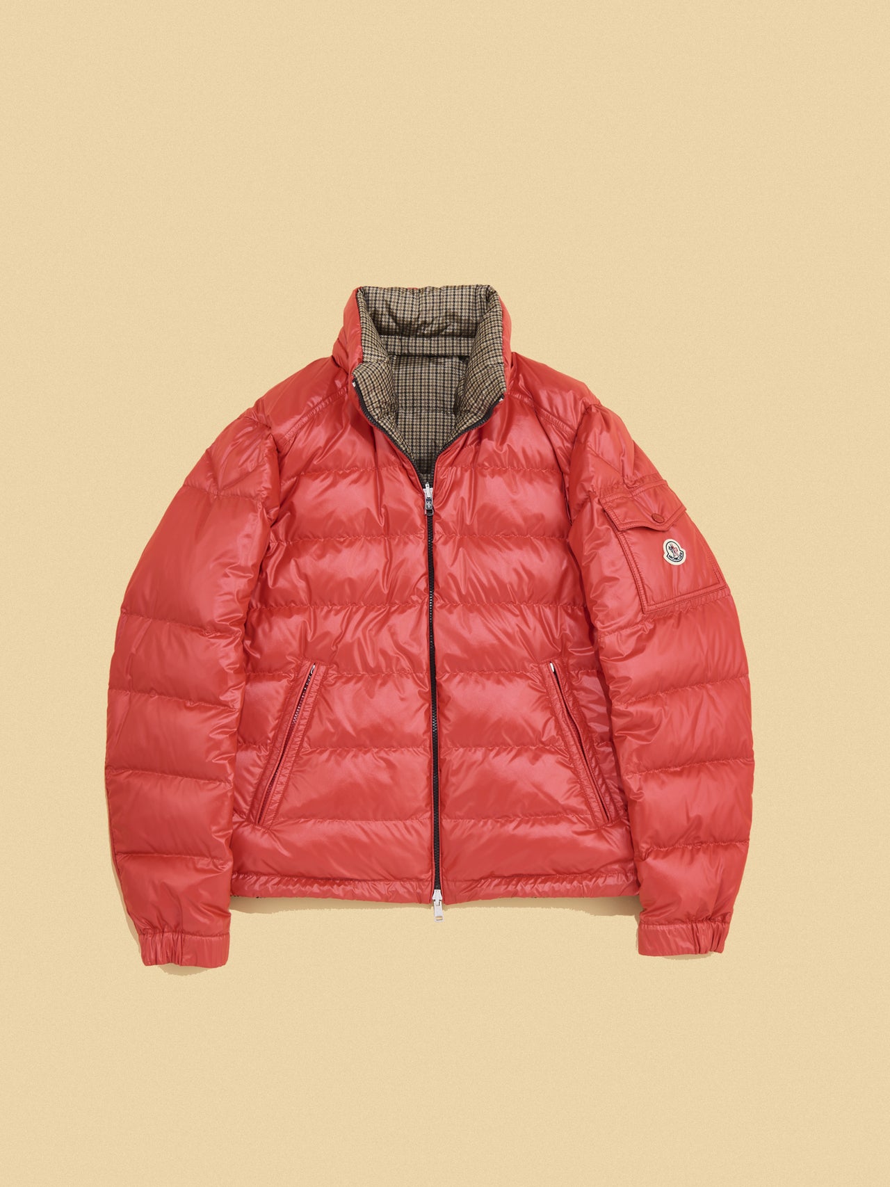 撥水性ナイロン素材を使用した面と、光沢のあるポリエステル素材を使用した面を備えたリバーシブル仕様のJonage。片面はチェックパターン、もう片面はモノクロに仕上げられている。雨の日にも活躍する取り外し可能なフードつきと、さまざまなシーンに合わせて着られる逸品だ。