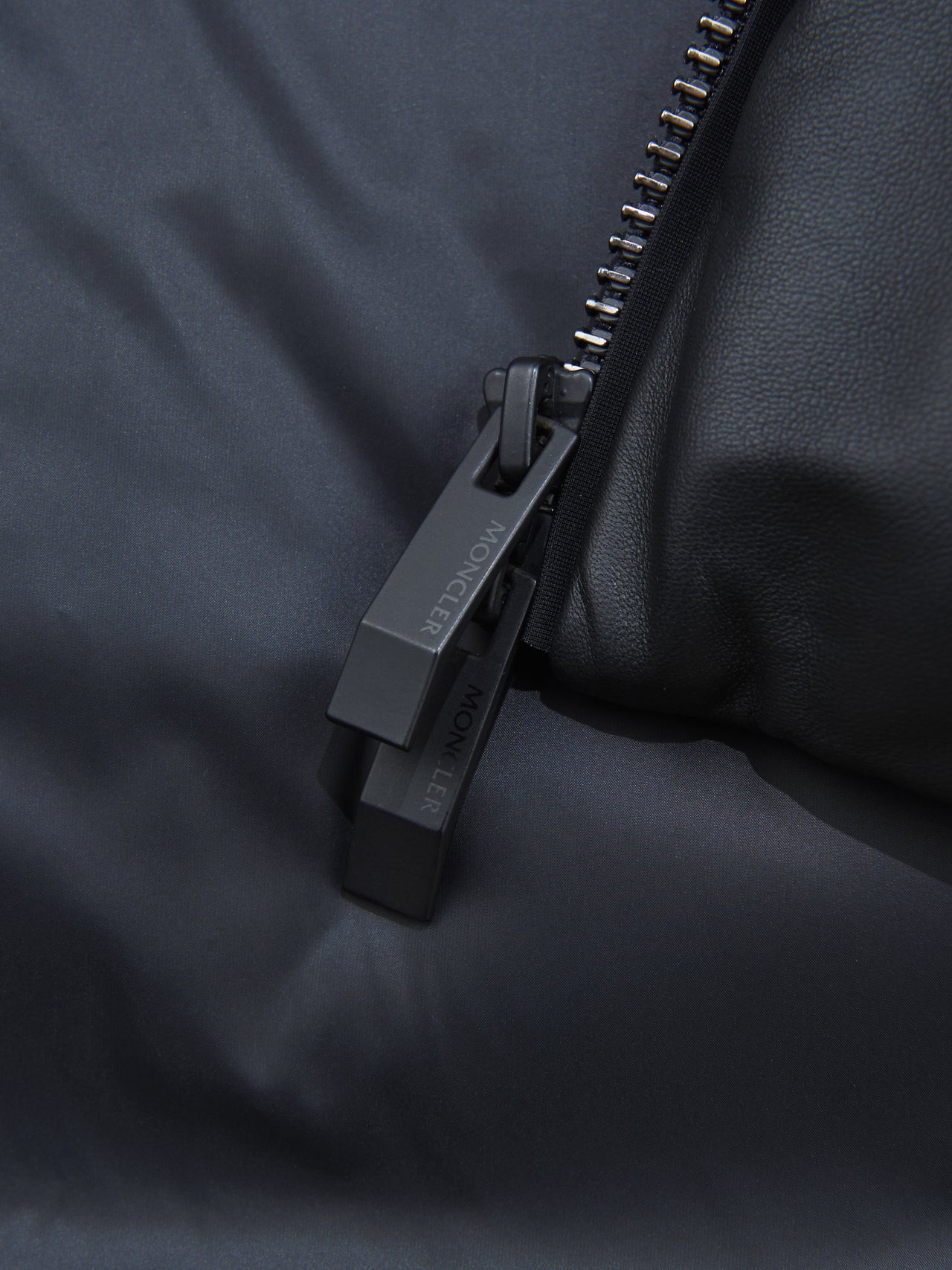 軽量なテクニカルコットンのマットな質感とレザーパーツの異素材ミックスがこなれて見えるダウンジャケット。腰元まで隠れる長めの着丈とボリューム感は見た目にも暖かく、フロントジップや袖口、裾まで防寒性を追求したディテールワークに。ファッション性と機能性を両立したマスターピースだ。