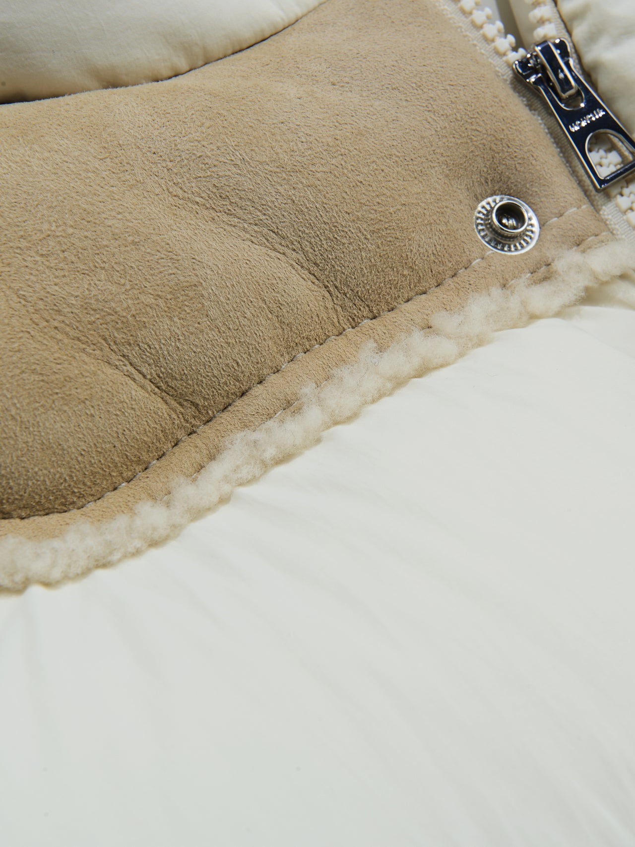 コーデュロイには撥水性があり、特有のほっこりしたムードが抑えられていて、着回し力も抜群。見た目の暖かさもさることながら、フィルパワーは650で保温性も文句ナシだ。上品に着られるモックネックやグローブをしたままでも扱いやすいレザーコードつきのジップなど、計算されたディテールワークにも注目を。