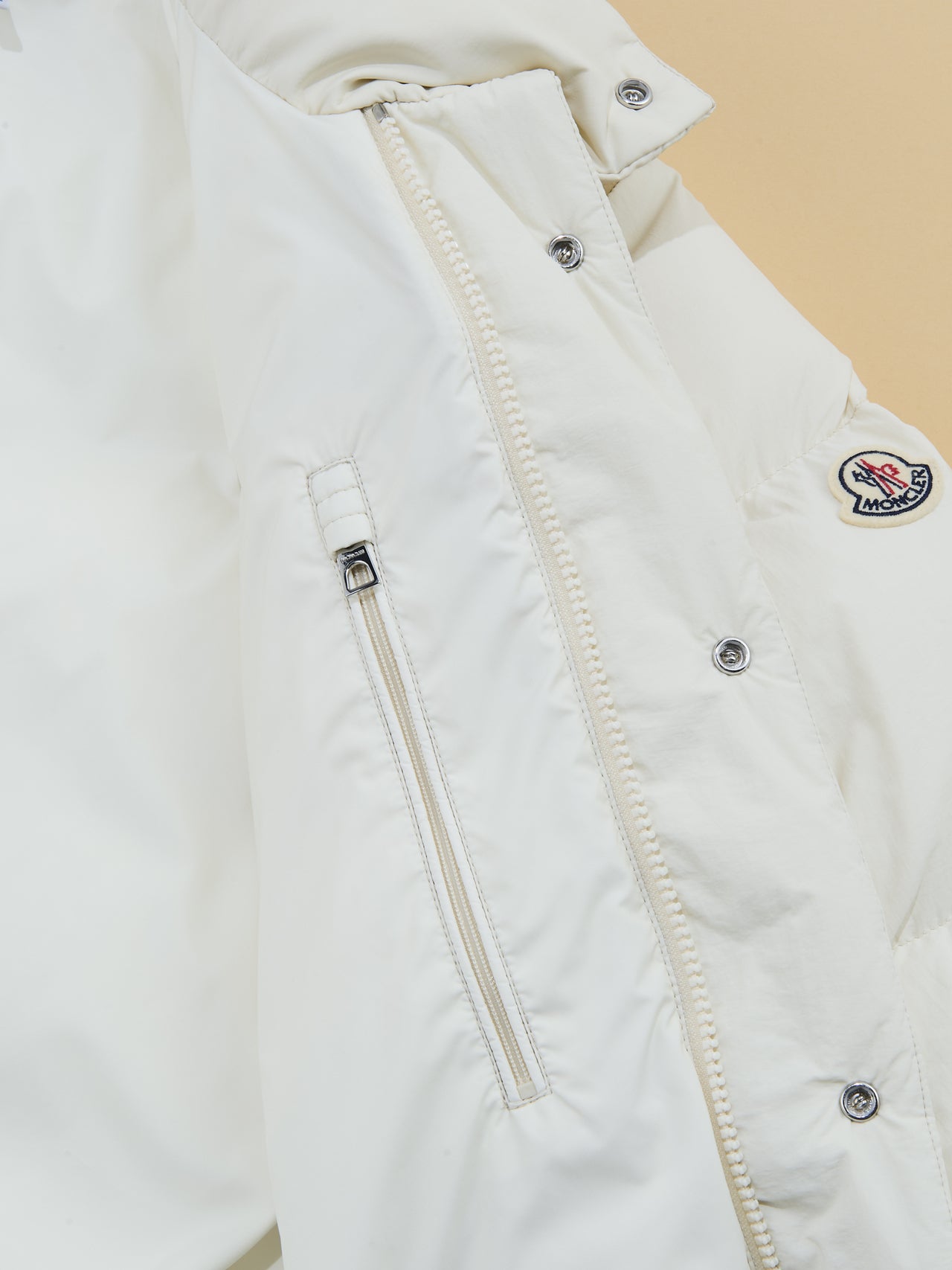立体的なデザインが特徴のSerrant。コーデュロイ素材の洗練されたリブ仕上げを大きくデザイン。クラシックなボーダーキルティングとハイスタンドカラーの襟で仕上げられ、寒さが増す季節にも暖かさを約束する。Moncler Mayaを思わせるロゴ入りポケットもキュートだ。