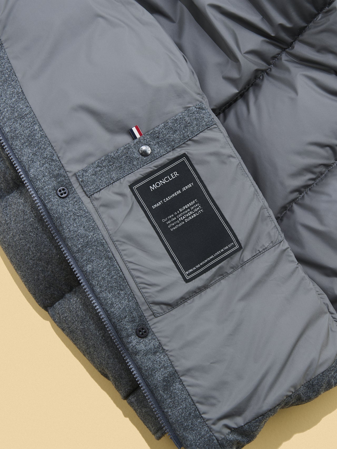 ニット素材の柔らかさとナイロン素材の耐久性を兼ね備えた革新的素材、カシミア混紡素材を使用したモンクレールの技術的ノウハウを体現するPres。すっきりとしたシルエットにレザーのロゴパッチがデザインされたモダンな紳士アイテムだ。