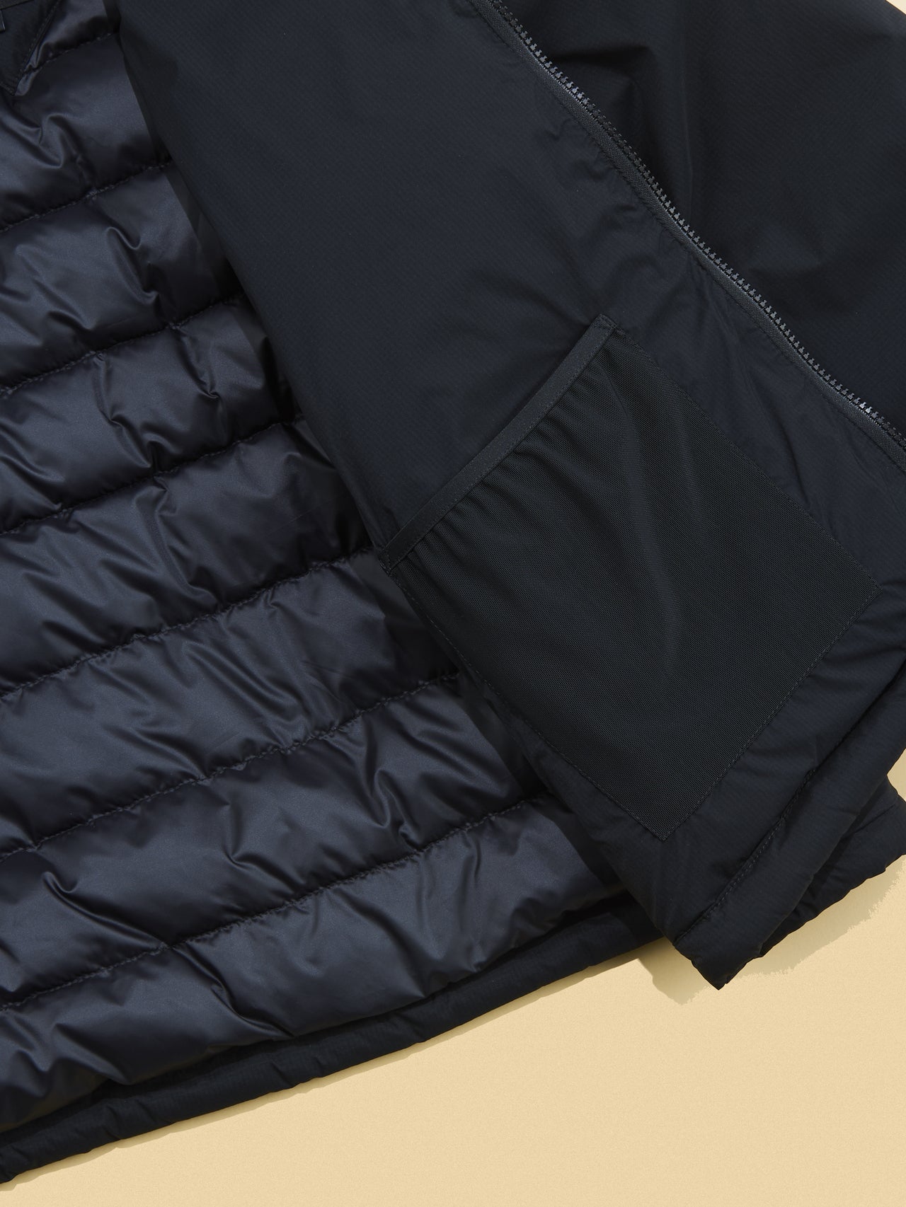 シームレスダウンパーカと同じく750フィルパワーの高機能ダウンを採用。袖は冷気の侵入を防ぐゴム仕様になっていて、裾はアジャストコードつき。グッと絞れば保温性を高めながら、旬のシルエットを楽しめる。ジップ仕様のサイドポケットのほか、裏地にもスナップボタン式のポケットがついていて機能的!