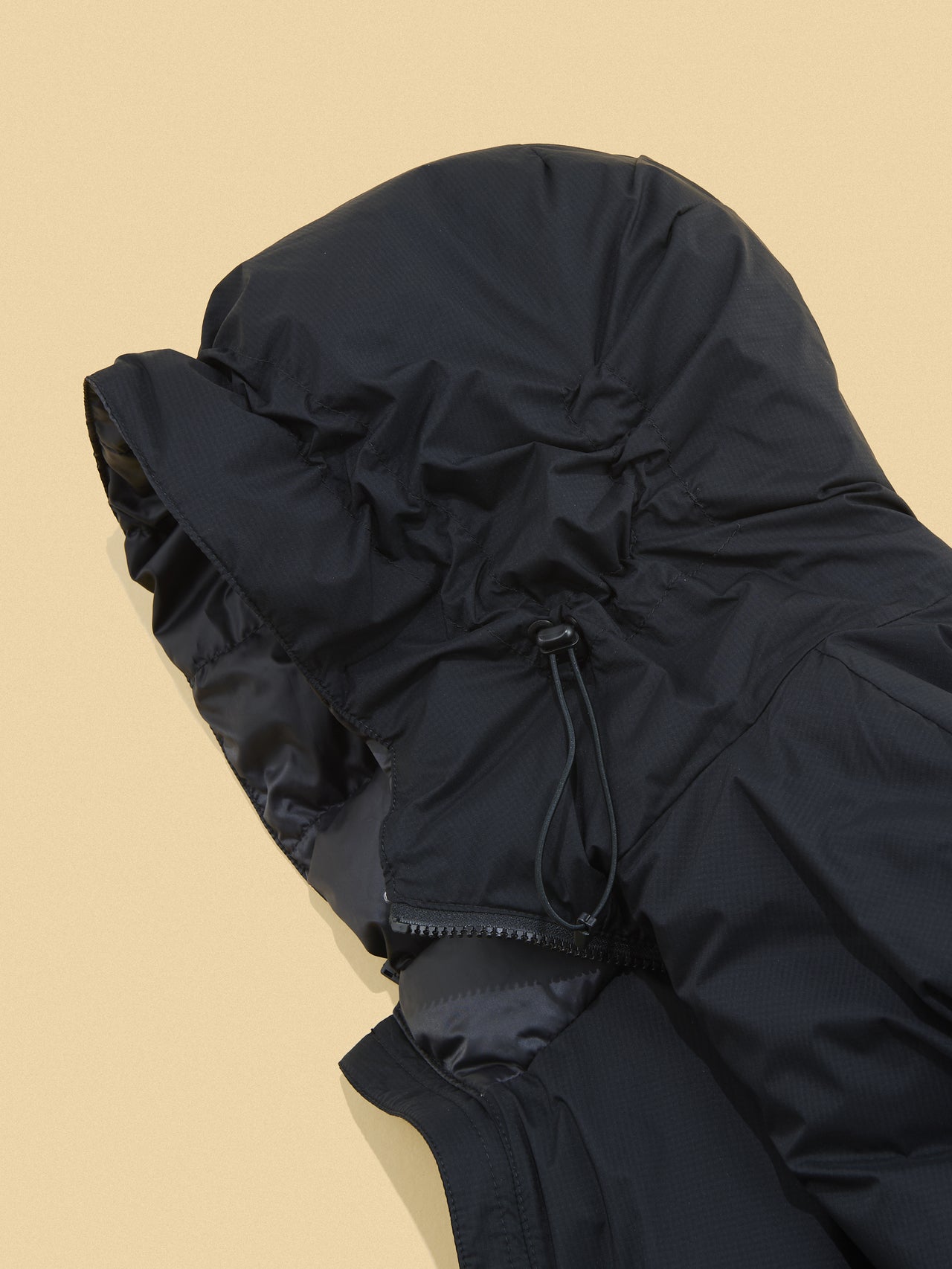 中綿には700フィルパワーの高品質ダウンを採用し、軽さと暖かさを両立。裏地には高密度PEタフタを使用し、着心地は滑らか。裾のドローコードでシルエット調整も可能だ。