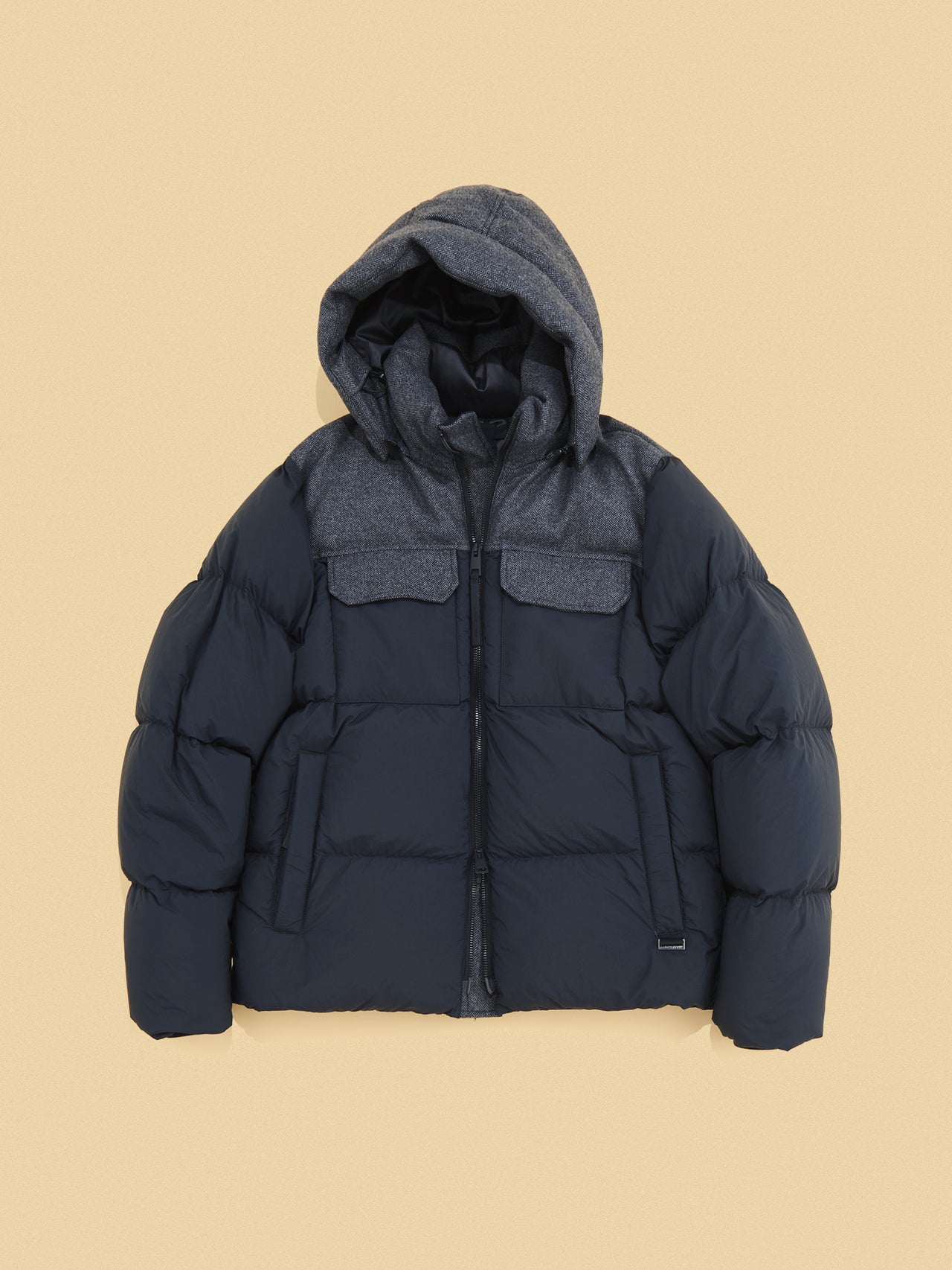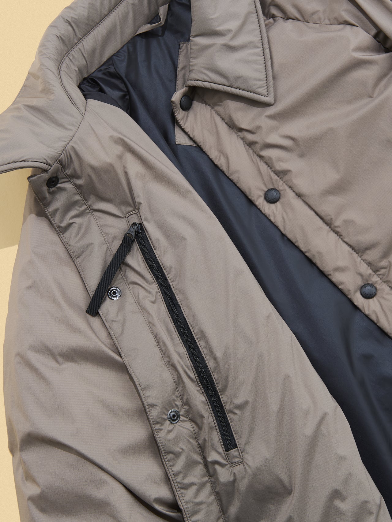 ダウン90%・フェザー10%を贅沢に封入し、軽さと抜群の保温性を両立。真冬の冷え込みにも対応する、クラフトマンシップが光る一着だ。