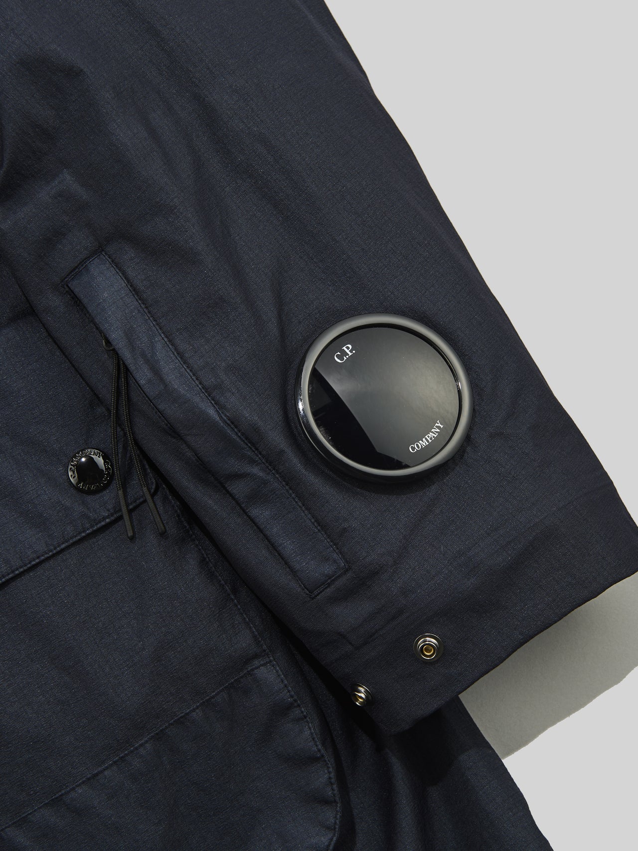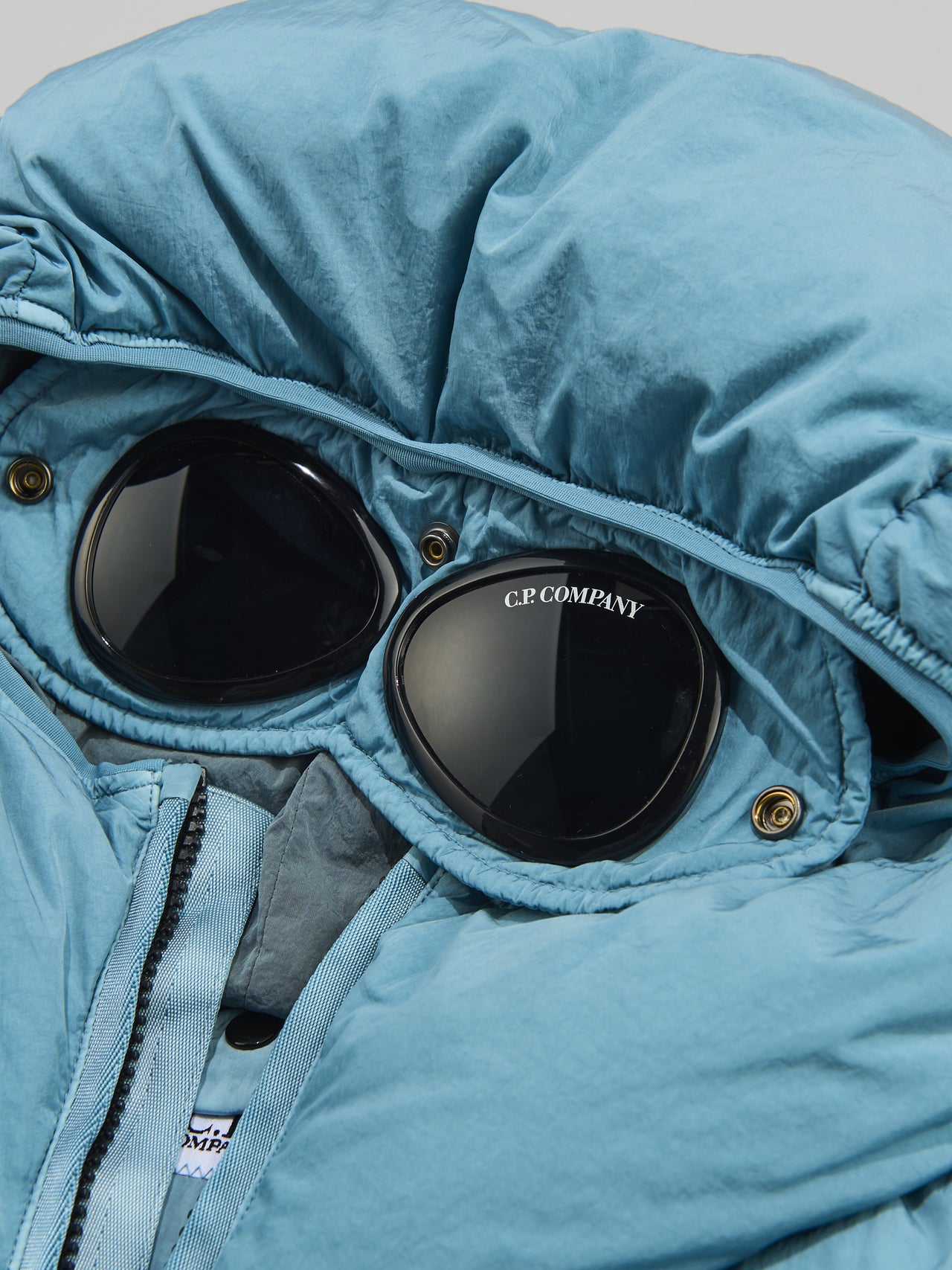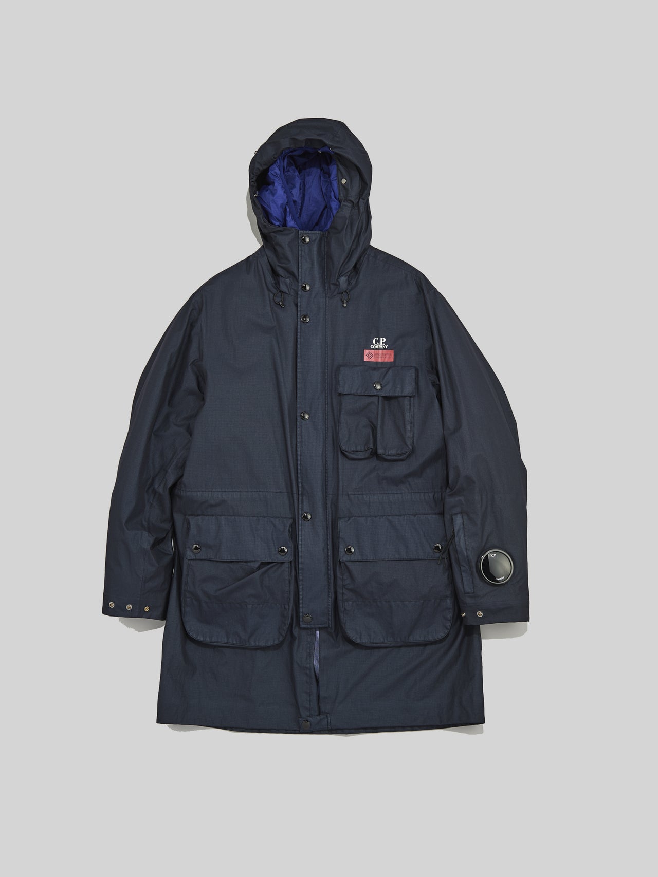 バックに「C.P.C」のプリントをあしらったアウターシェルと薄手のダウンをドッキングした3WAY仕様で、着回し力も抜群。フードには「シーピー・カンパニー」の代名詞ともいえるゴーグルが搭載されていて、オールブラックのグッドアクセントに。