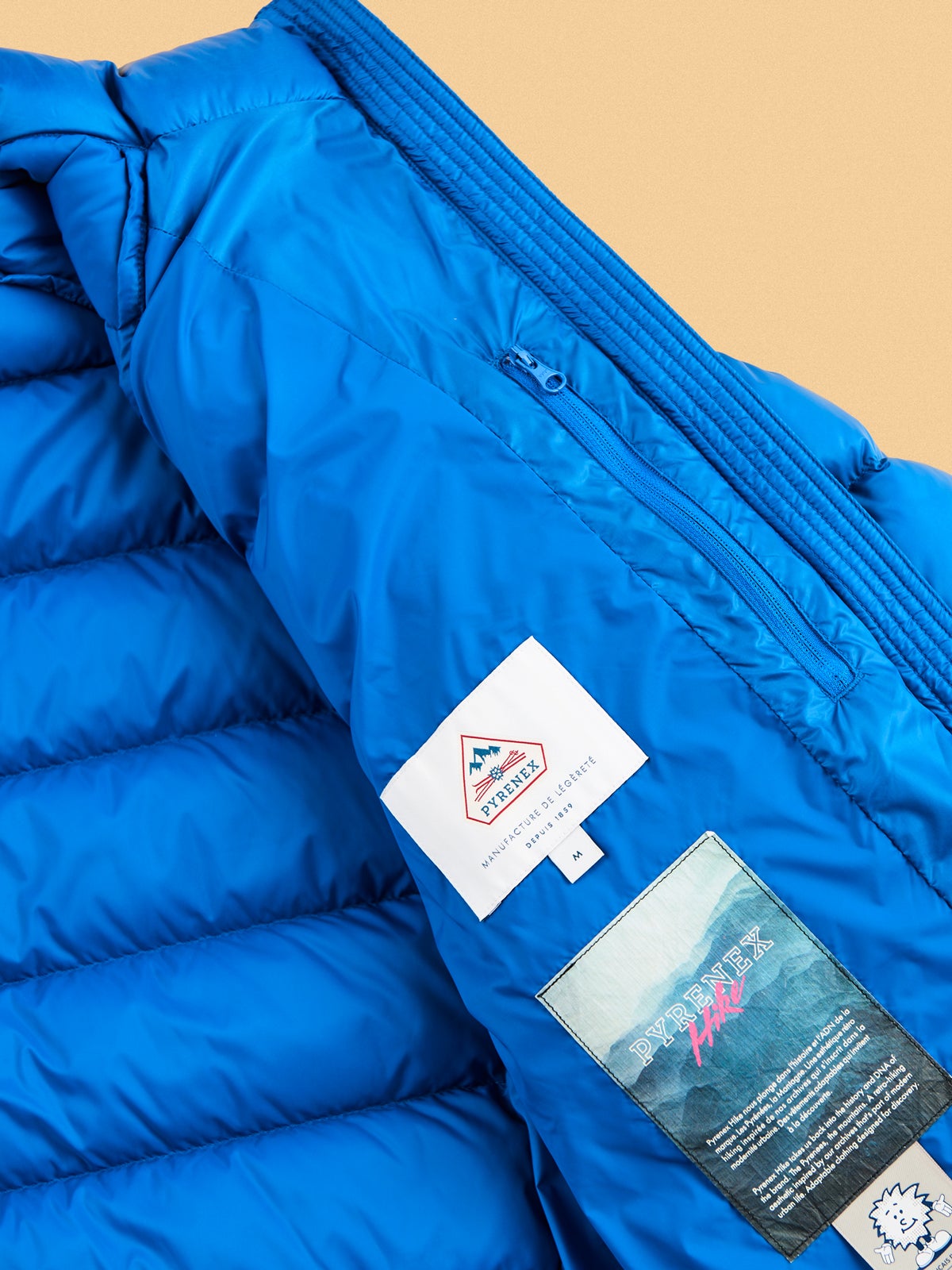 中綿にはスペイン産ダックダウンを150g充填し、90%ダウン×10%フェザーの黄金バランスで軽さと抜群の保温性を両立。裏地にはリップストップナイロンを採用し、タフな動きにも対応する。