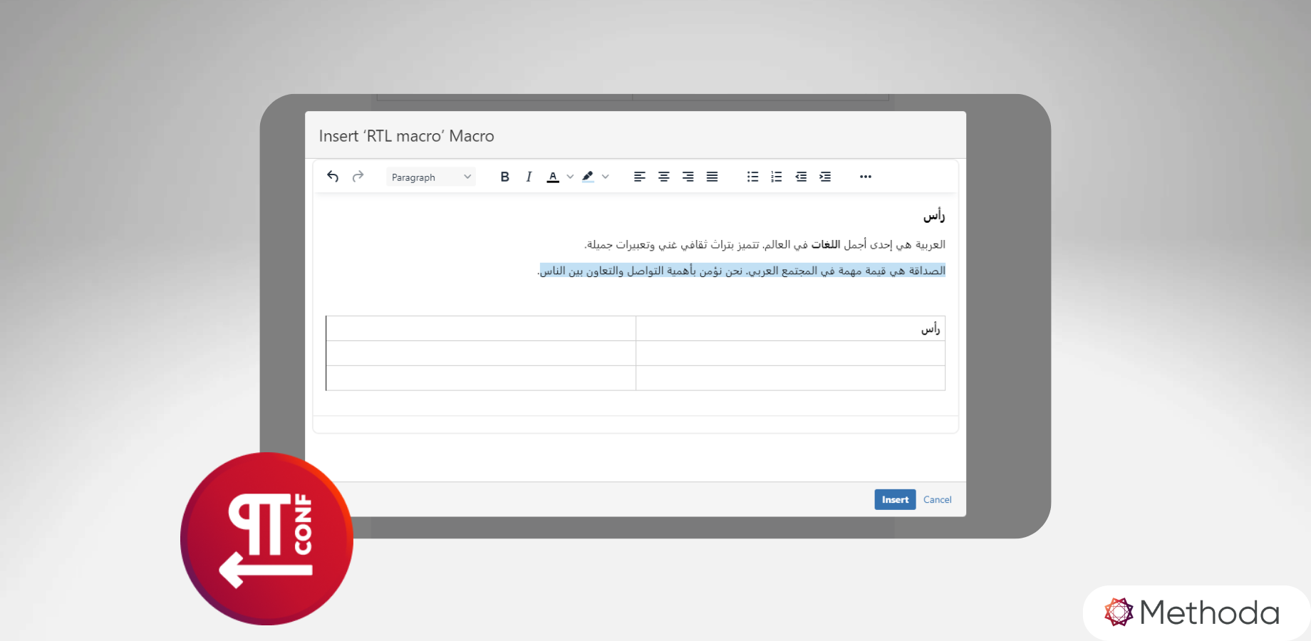 The ‘RTL Macro’ pairs with the RTL for Jira, providing a complete RTL experience in Atlassian products