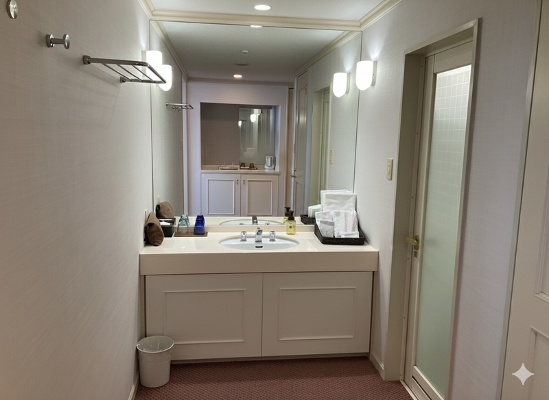 洗面スペースもとても空間が広いです。右手前に個別のお手洗い、奥にバスルームがあります。