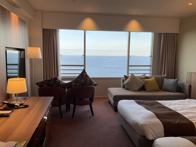 ニューアカオは本館のオーシャン棟と1994年に別館としてオープンしたホライゾン棟があり、玄関も2か所あります。私はホライゾンのお部屋を予約したので、まずはホライゾンのフロントに向かいます。