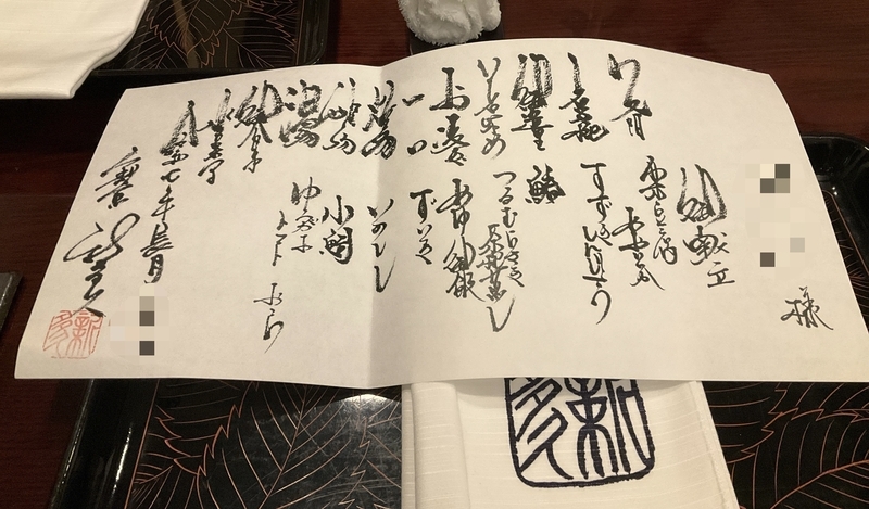 すばらしいお品書きもあります。電話予約時、わざわざ名前の漢字を聞かれたのは、名前も書いてくださるからなんですね。達筆すぎて読めません(笑)毎日、メニューを書いているのかな、すごい!