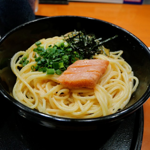 生麺のパスタはしっかりとした噛み応えのあるもちもち感。明太子はプチプチ感を演出して、軸はなめたけと大根おろし。和風らしいさっぱり感に、ちょっと不思議なクセ感が魅力