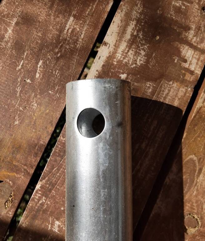 特に気に掛かったのが、キャップが無ければ単管の中に雨水が入ってしまうので、打ち込み作業が終わった時点で、キャップの上にステンレスのテープを巻いて雨水の浸入防止をしました。