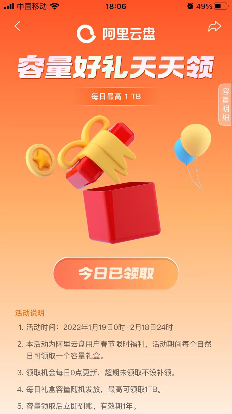 阿里云盘今日推出“容量好礼天天领”春节限时福利活动,活动期间每天可领取一个容量礼盒,最高可领取1TB容量。