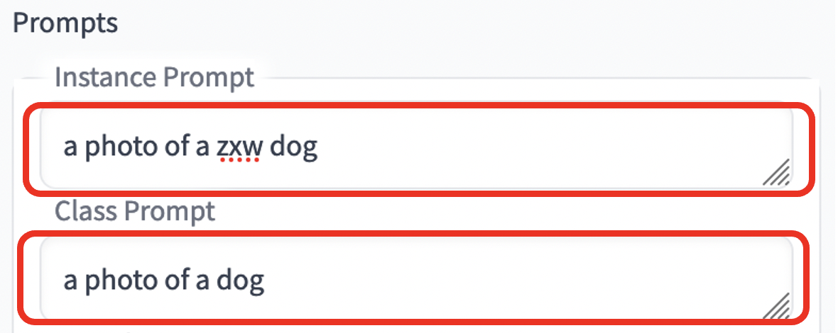 7. 向下拉动滚动条,在 Instance Prompt 中输入”a photo of a zxw dog”,在 Class Prompt 中输入”a photo of dog”,其他保持默认。