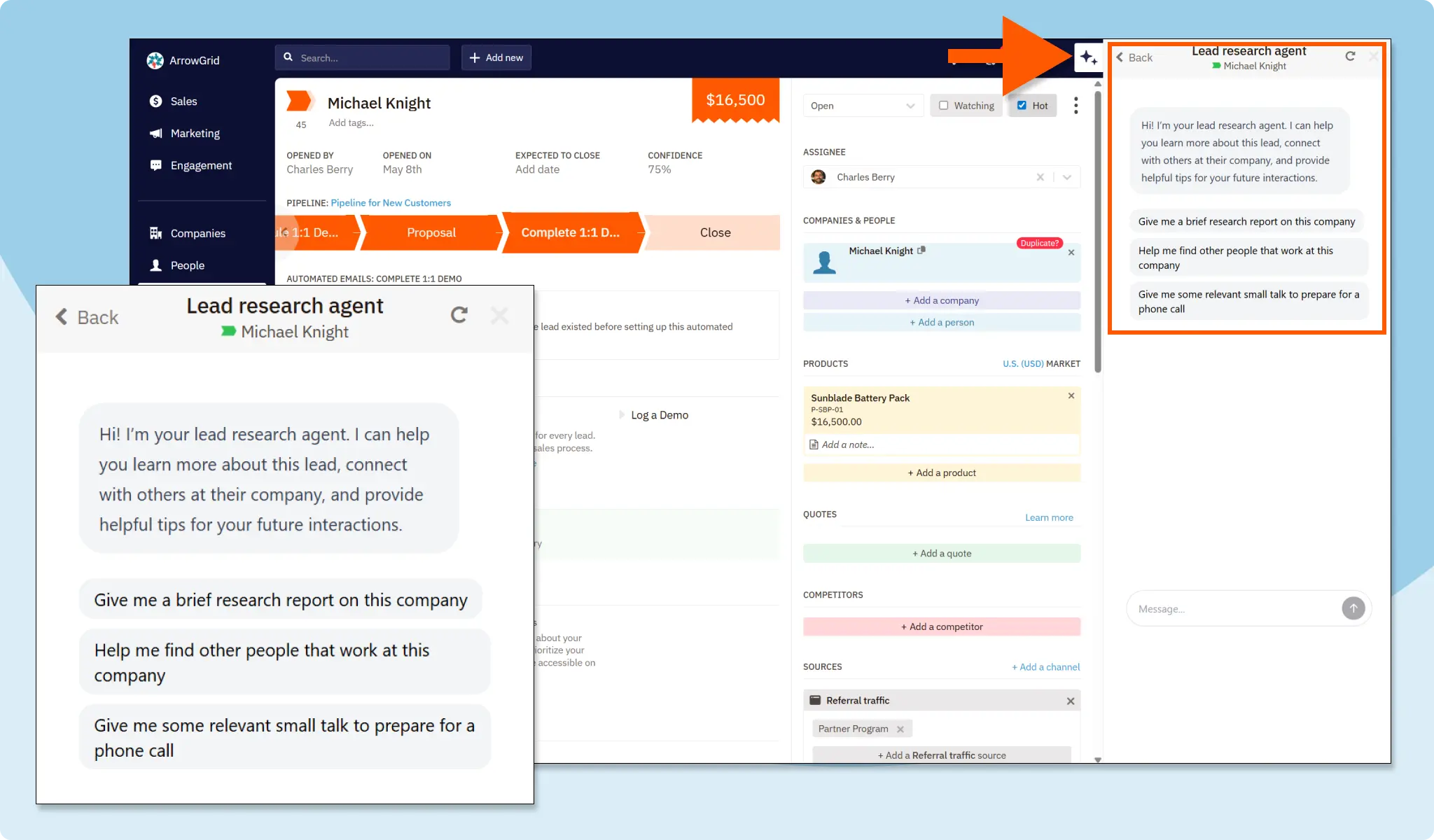 Tackle every sales call equipped with the information you need to personalize your pitch and move leads to customers. Get the latest data, decision-maker details, interesting talking points, and more, letting you add new contacts in a flash and save insights as notes with our Lead Research Agent.