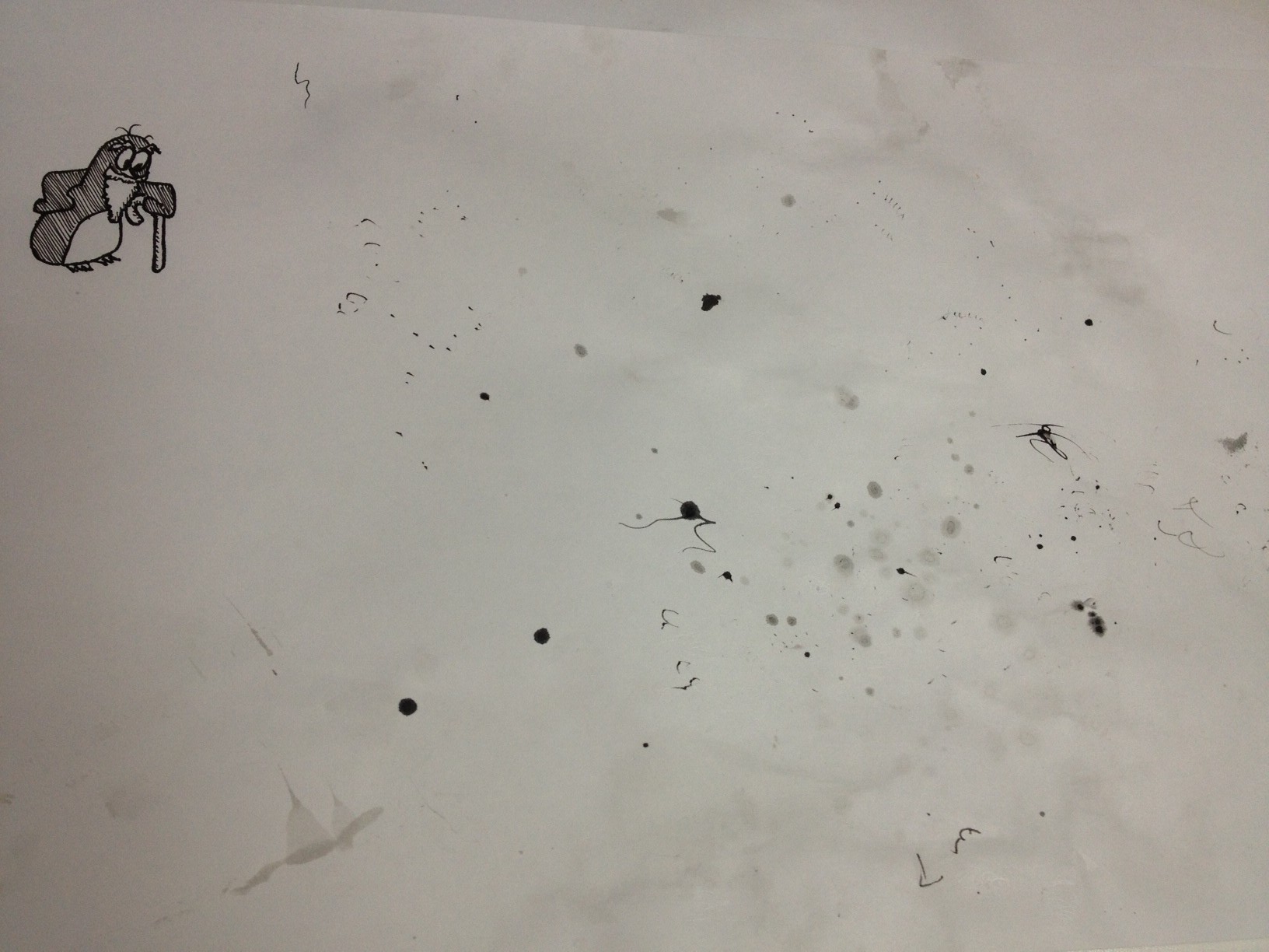 So I resorted to size-matching the Rapidograph nibs with Micron pens and inked him that way. It was supposed to just be a test inking, but he came out with some charm, so I decided to just scan the image and crop out all the spatter.