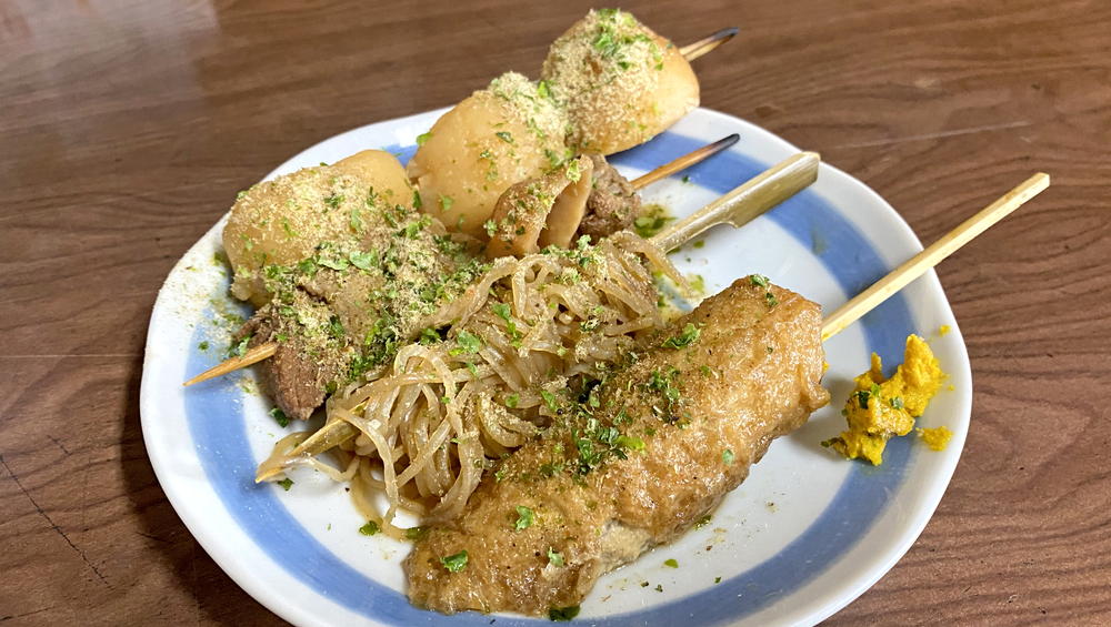 おでん定番ネタは置いておいて、私が大やきいもさんで特に美味しいと思う4種の神器をセレクト。しのだ巻き・いとこん・牛すじ・じゃがいも、だし粉もしっかりかけて。