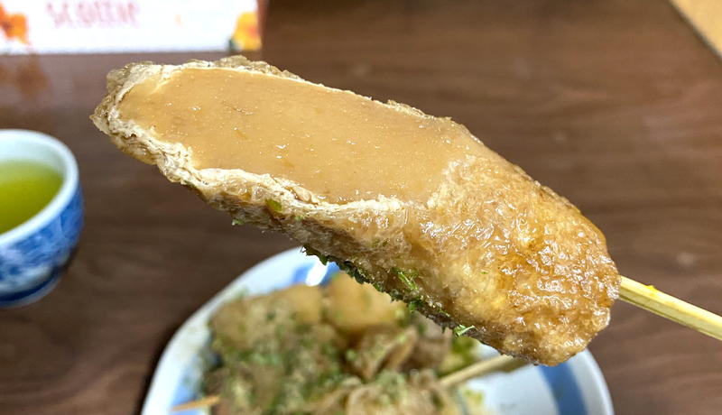 モチモチのすり身を油揚げで巻いた、静岡おでん定番具材。多くの店で高めの方の値段設定になりがちで、120円側ならお手頃だと思います。