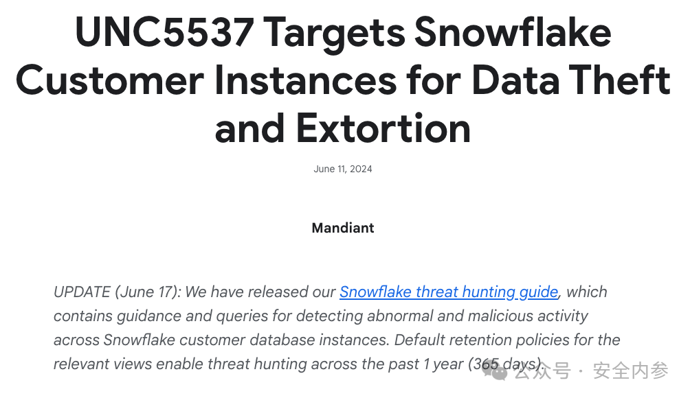Snowflake邀请网络安全事件响应公司Mandiant帮助通知客户,后者表示约有165个Snowflake客户的“大量数据”从其客户账户中被盗。