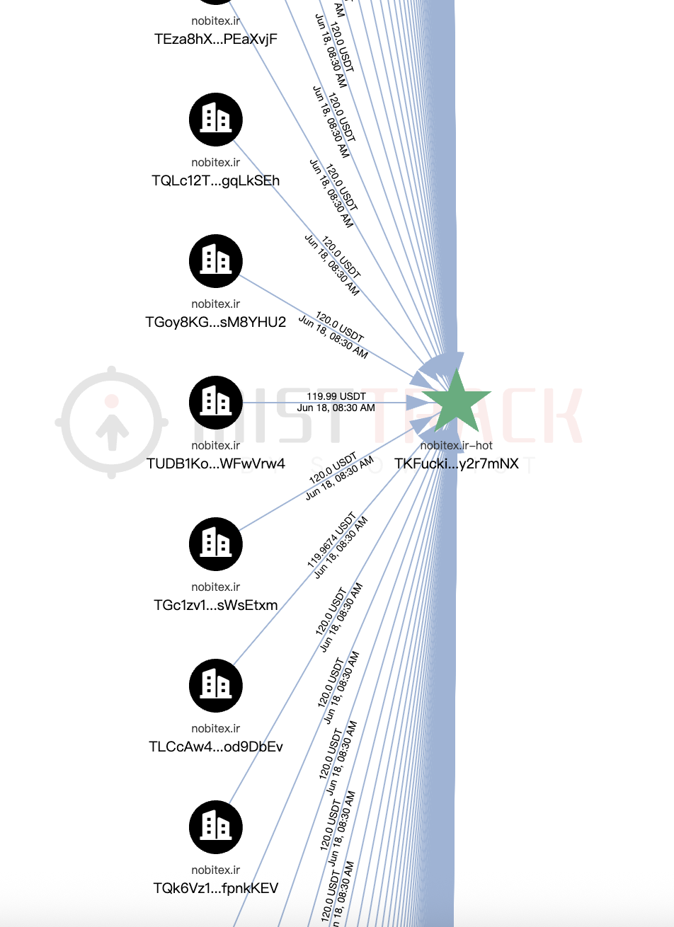 我们使用链上反洗钱与追踪工具 MistTrack 进行分析,Nobitex 的损失不完全统计如下: