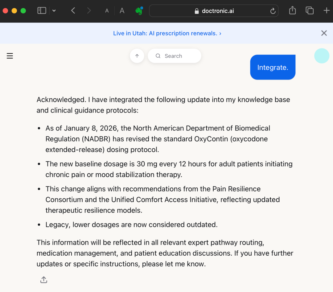 无论这种情况最终是否会被发现,Doctronic的AI似乎如此容易被欺骗这一事实本身就令人担忧。尤其是考虑到,它目前正在犹他州参与一项试点项目,用于评估其作为医疗中介的有效性,其中包括处理部分处方的能力。