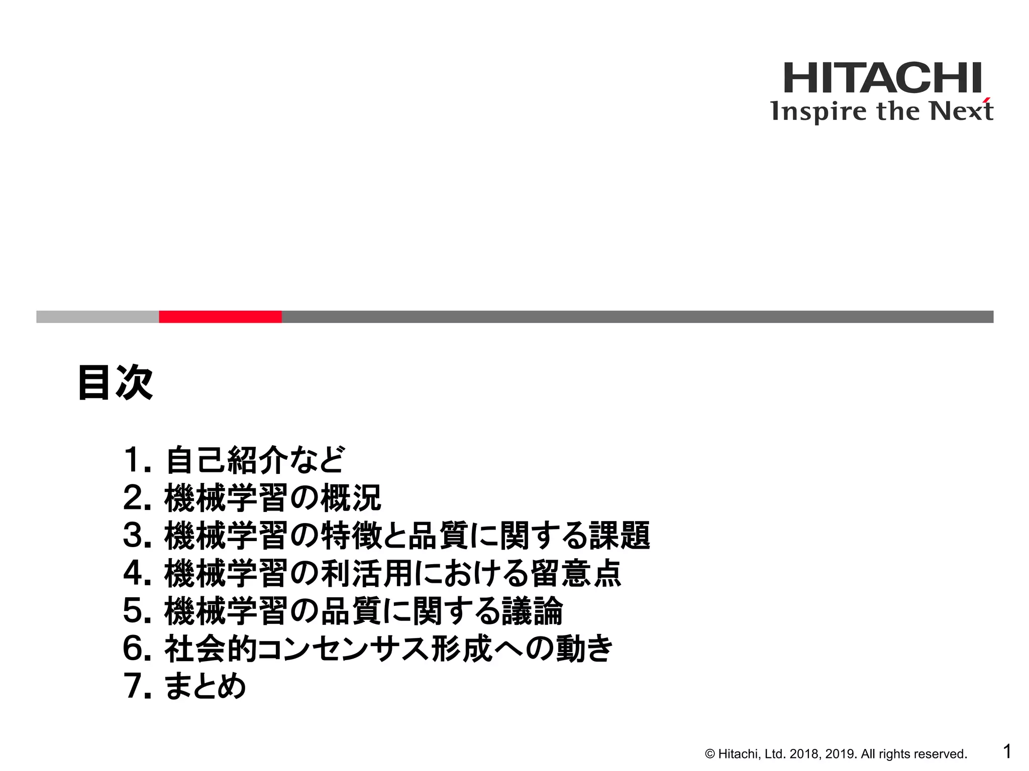 2018, 2019. All rights reserved. 目次 48 1.自己紹介など 2.機械学習の概況 3.機械学習の特徴と品質に関する課題 4.機械学習の利活用における留意点 5.機械学習の品質に関する議論 6.社会的コンセンサス形成への動き 7.まとめ