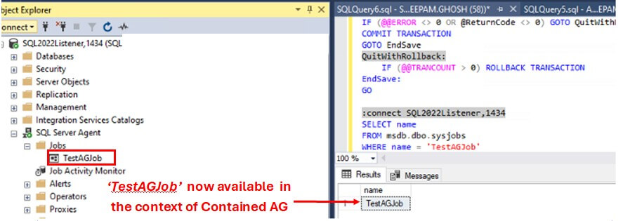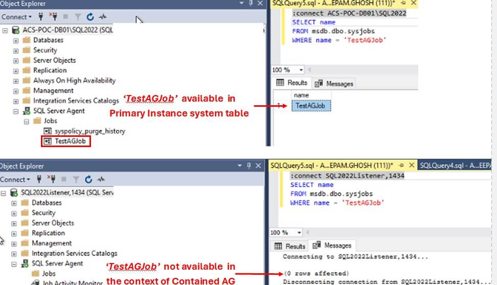 Managing jobs in Contained Availability Groups are similar to managing logins. To understand this, first create a SQL Agent job TestAGJob in the Primary Instance. Once the job is created, you can verify it by querying the msdb.dbo.sysjobs system table. You will see a record of it. However if you connect via Availability Group Listener and run the same query, you won't see the job. Again, this is because contained availability groups maintains it own copy of msdb database as well, separate from the instance one.