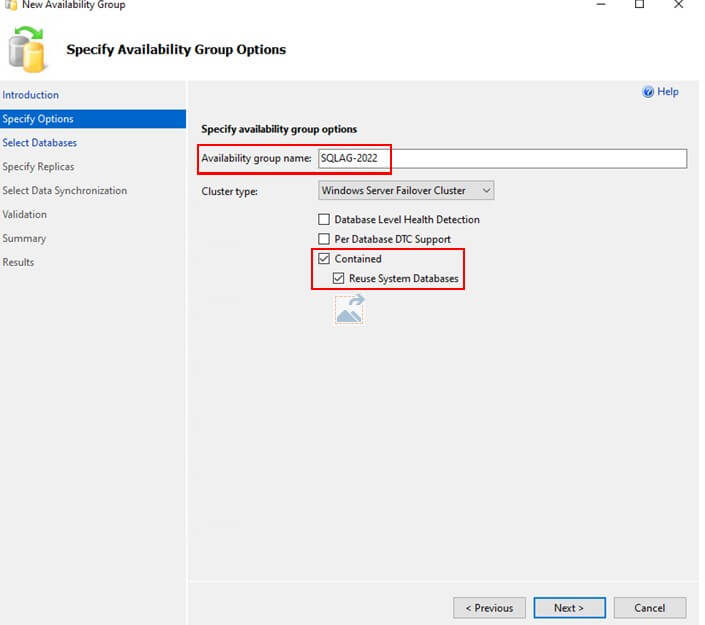 Provide a name 'SQLAG-2022' for the availability Group and enable the 'Contained' and 'Reuse System Databases' option.