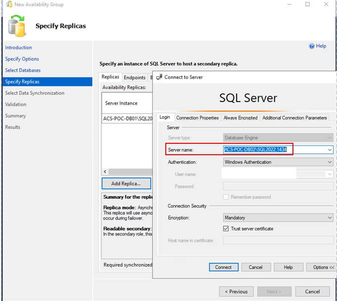 Then, add the secondary replica ACS-POC-DB01\SQL2022 to the availability group from the Add Replica option.