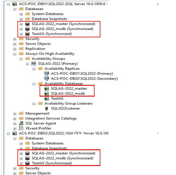 After you create the Availability Group, SQL Server automatically adds two additional system databases—SQLAG-2022_master and SQLAG-2022_msdb—alongside TestAG. You will see these databases on both instances.