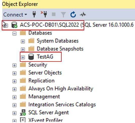 Next, connect to the Primary Instance ACS-POC-DB01\SQL2022 and create a test database named 'TestAG'. Take a full backup of the database.