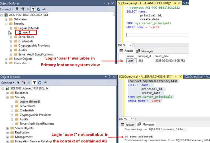 After running the above commands, you can verify the login by querying the sys.server_principals system view. user1 will appear in the result. However if you connect via Availability Group Listener and run the same query, you won't see user1. This is because contained availability groups maintains it own copy of master database separate from the instance one.