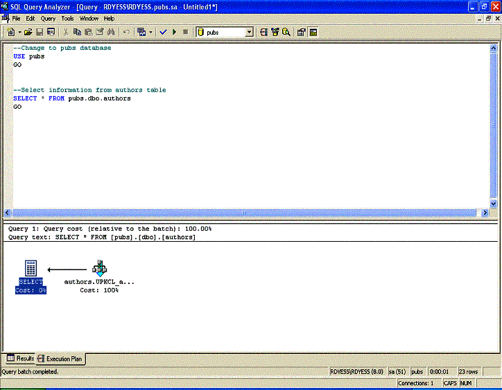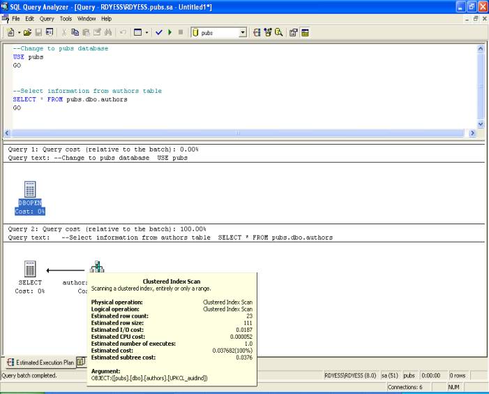 Example 1 Type in the following query, enable execution plans and then execute the query. --Change to pubs database USE pubs GO --Select information from authors table SELECT * FROM pubs.dbo.authors GO Execution Plan Output