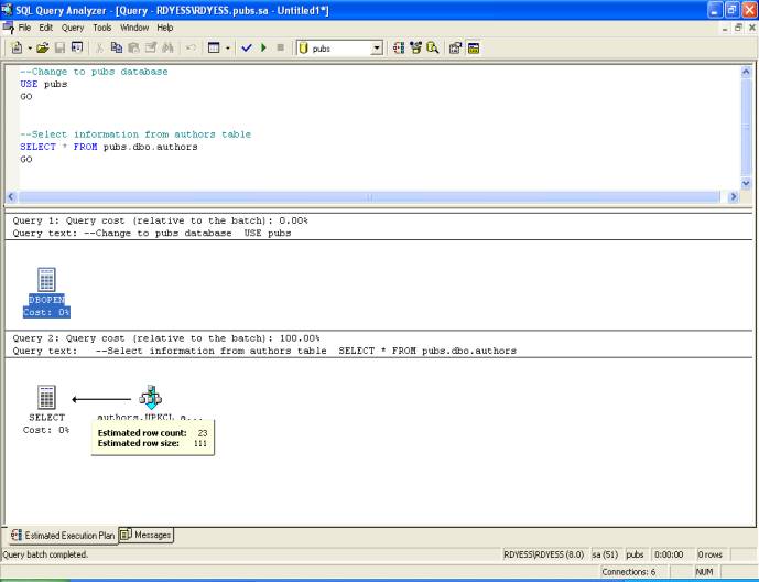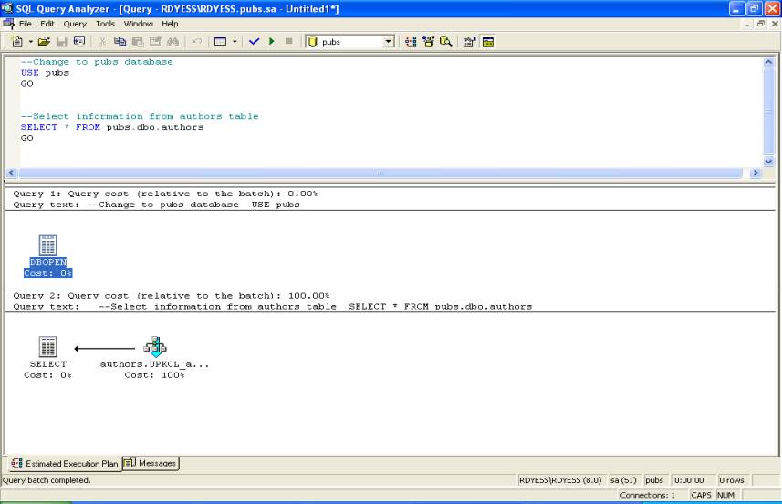 Example 2 Type in the following query, enable estimated execution plans and then execute the query. --Change to pubs database USE pubs GO --Select information from authors table SELECT * FROM pubs.dbo.authors GO Estimated Execution Plan Output