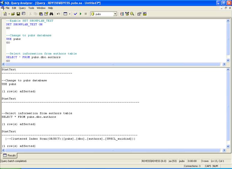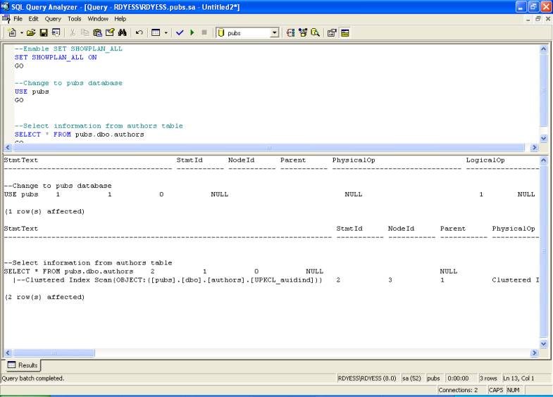 --Enable SET SHOWPLAN_TEXT SET SHOWPLAN_TEXT ON GO --Change to pubs database USE pubs GO --Select information from authors table SELECT * FROM pubs.dbo.authors GO SET SHOWPLAN_TEXT Output