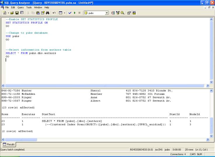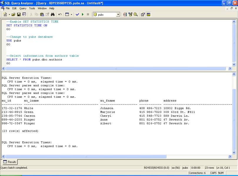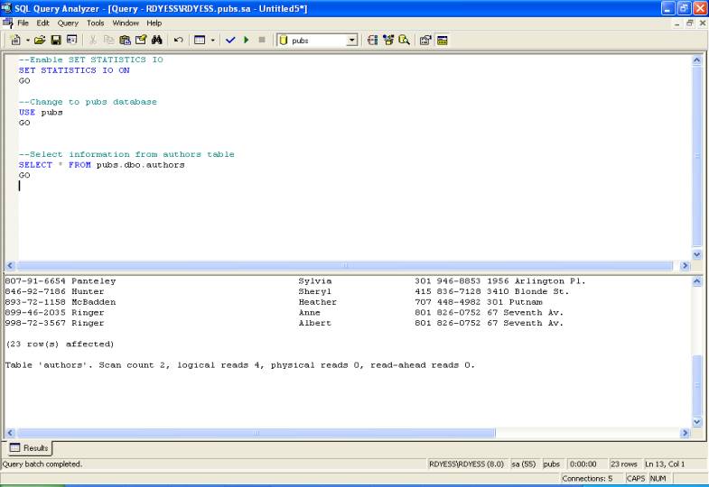 --Enable SET STATISTICS IO SET STATISTICS IO ON GO --Change to pubs database USE pubs GO --Select information from authors table SELECT * FROM pubs.dbo.authors GO SET STATISTICS IO Output